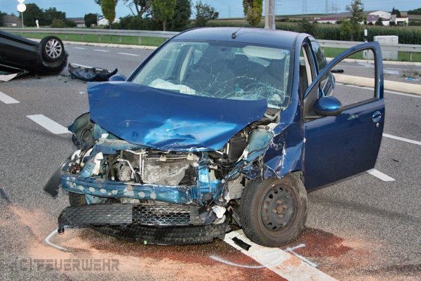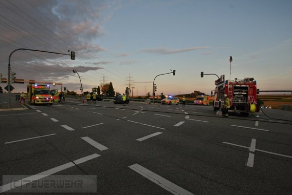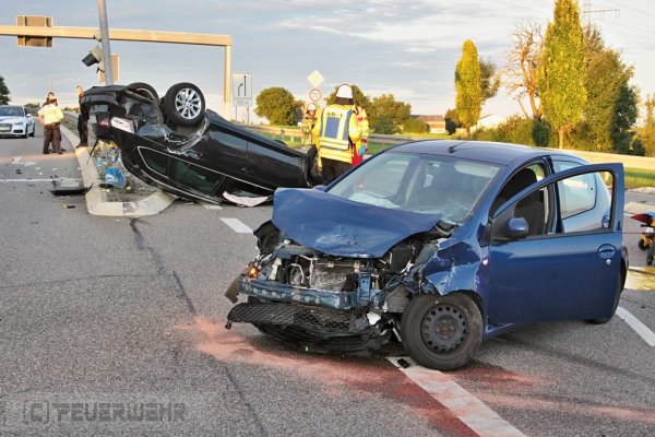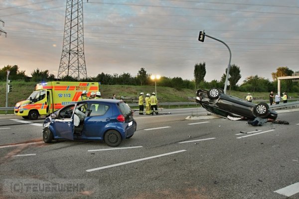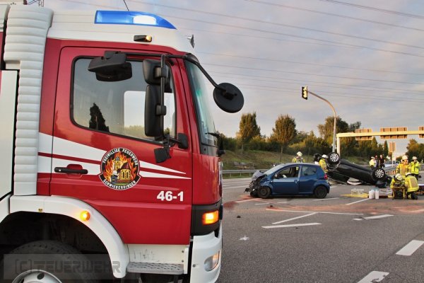 Beim Eintreffen der Feuerwehr am Einsatzort, wurde festgestellt, dass zwei PKW im Krezungsbereich kollidiert waren. Eines der beiden Fahrzeuge hatte sich überschlagen einen Ampelmast gerammt und war auf dem Dach liegengeblieben. Entgegen der ursprünglichen Annahme war niemand mehr in seinem Fahrzeug eingeklemmt.