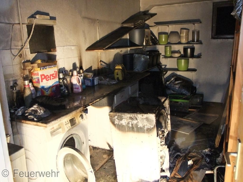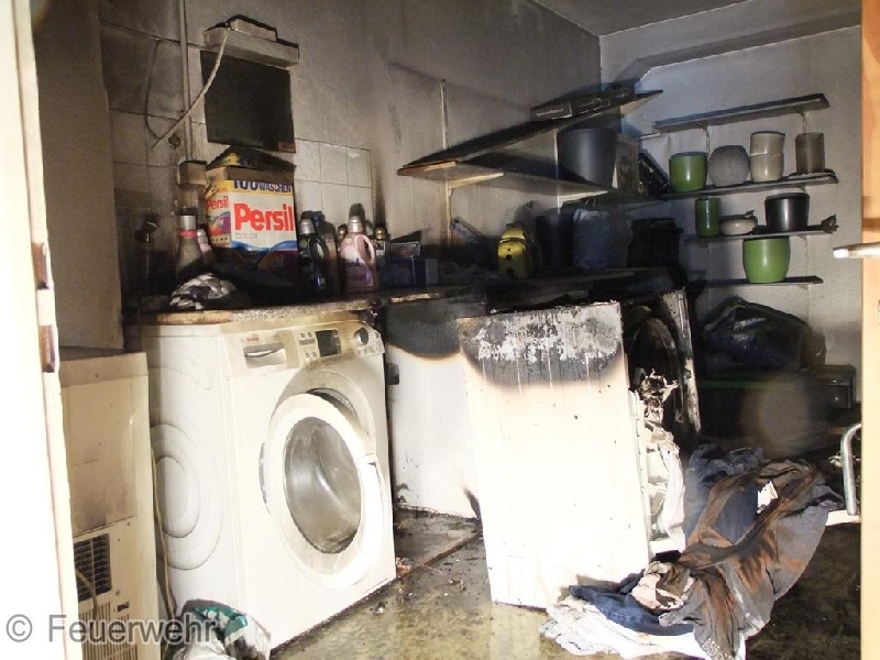 Ein zweiter Trupp brachte im betroffenen Bereich einen mobilen Rauchverschluss an. Der Brand konnte schnell mittels Wärmebildkamera lokalisiert und dann gelöscht werden. In der Waschküche war ein Trockner in Brand geraten, welcher bereits auf umstehende Geräte und Gegenstände übergegriffen hatte. Anschließend wurde ein Fenster geöffnet und der verrauchte Bereich mittels Belüftungsgerät rauchfrei gemacht.