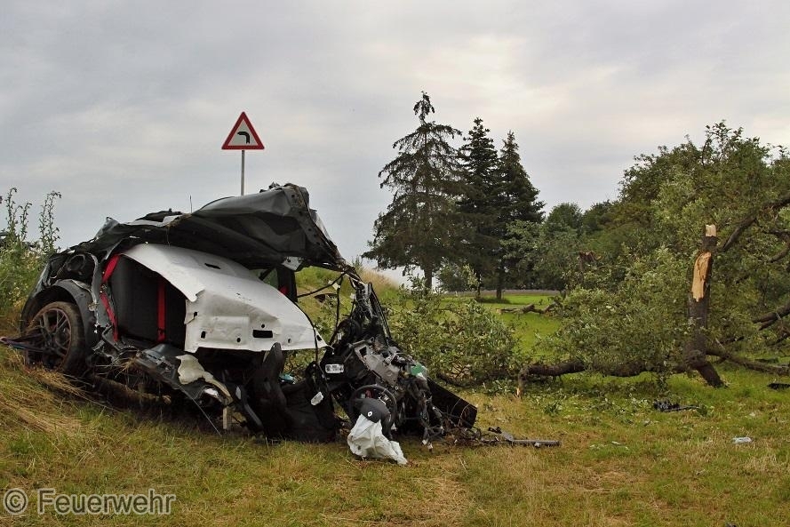 Ein beteiligter PKW kam von der Fahrbahn ab, und prallte gegen mehrere Bäume, dabei wurde das Fahrzeug in zwei Teile zerissen.