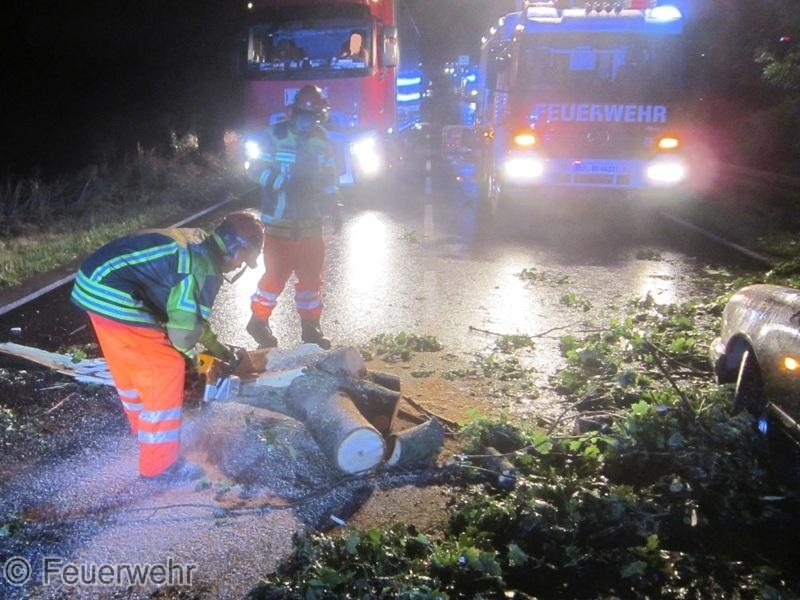 Es stellte sich zudem heraus, dass einer der Bäume auf ein Fahrzeug gestürzt war. Darin wurde eine Person eingeschlossen, zwei weitere Mitfahrer konnten sich bereits befreien. Daraufhin wurden weitere Kräfte nachalarmiert. Der Fahrer konnte unverletzt durch die Feuerwehr mit mehreren Kettensägen befreit werden.