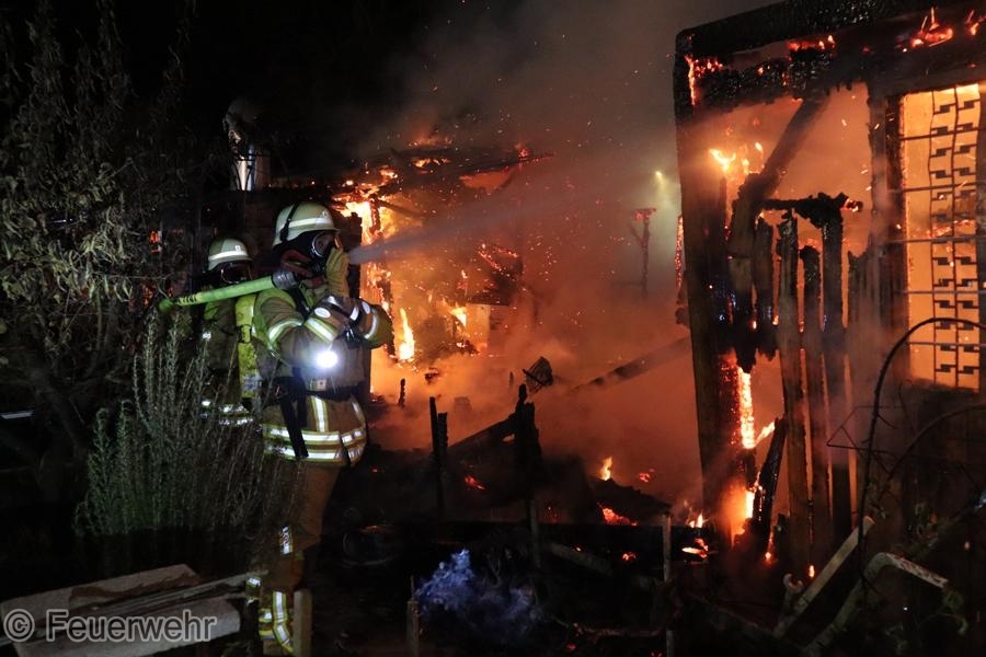 Am Samstag, gegen 22:40 Uhr, meldeten Anrufer, dass beim Frauenwiesenweg mehrere Gartenhütten brennen würden. Beim Eintreffen der Feuerwehr- und Polizeikräfte befand sich eine Hütte im Vollbrand. Dadurch wurden drei weitere Hütten in Brand gesetzt und zerstört bzw. beschädigt. Ursächlich für den Ausbruch des Brandes war vermutlich ein Feuer in einem Holzofen das nicht richtig verloschen war. Die Feuerwehr war insgesamt mit 26 Kräften und 6 Fahrzeugen aus Markgröningen und Schwieberdingen vor Ort. Außerdem waren ein Rettungswagen und drei Streifen der Polizei im Einsatz. Der durch den Brand entstandene Sachschaden wird auf ungefähr 12.500 Euro geschätzt.