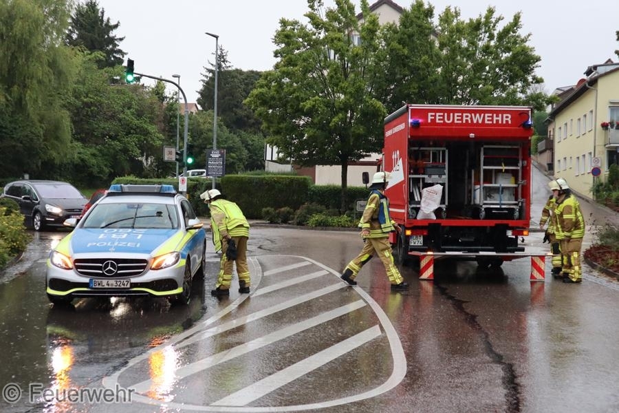 Zu einer Kraftstoffspur entlang der Stuttgarter Straße wurde die Feuerwehr am Sonntagnachmittag alarmiert. Der ausgelaufene Kraftstoff wurde durch die Feuerwehr mit Bindemittel aufgenommen.