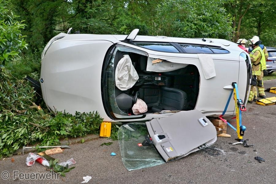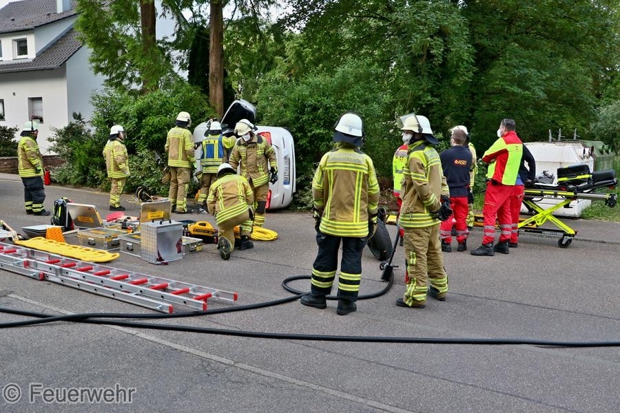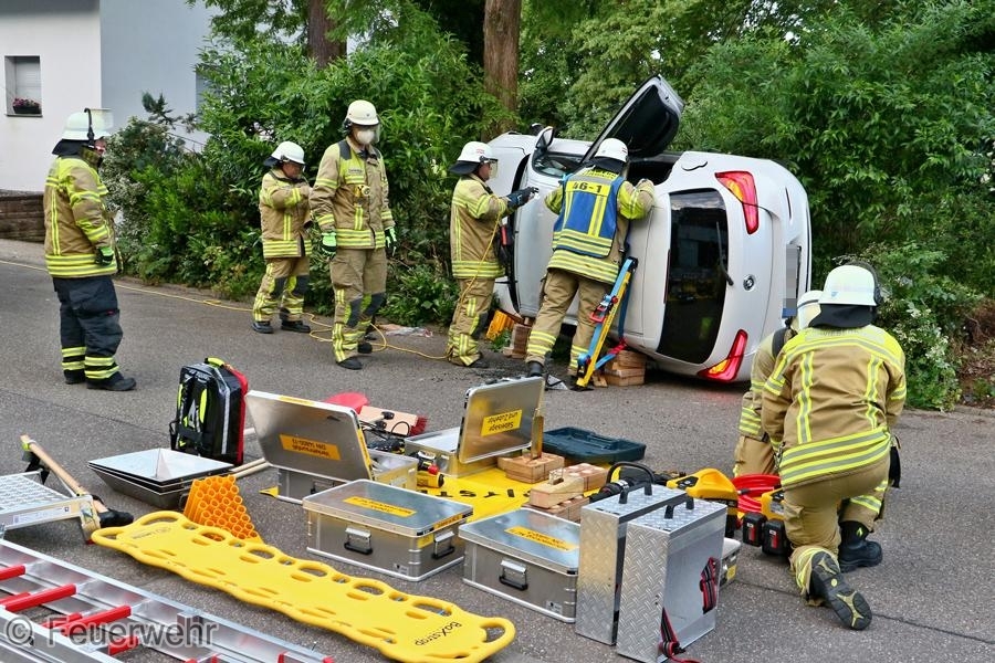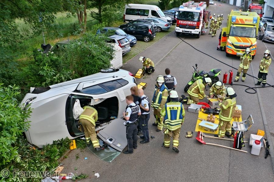 Zu einem Verkehrsunfall mit einer eingeklemmten Person wurde die Feuerwehr am Donnerstagmorgen in die Holdergasse alarmiert. Ein Fahrzeug war alleinbeteiligt von der Fahrbahn abgekommen, prallte auf ein parkendes Motorrad und einen Begrenzungsstein und kam auf der Seite zum liegen. Der Fahrer wurde dabei in seinem Fahrzeug eingeschlossen und konnte dieses nicht verlassen. Die Feuerwehr übernahm die Betreuung sowie die technische Rettung des Verletzten. Das Fahrzeug wurde gesichert und der Brandschutz sichergestellt. Es wurde ein Zugang über das Dach geschaffen und die Person dem Rettungsdienst übergeben. An der Einsatzstelle befanden sich neben der Feuerwehr auch die Polizei mit zwei Streifenwagen, der Rettungsdienst sowie ein Notarzt.