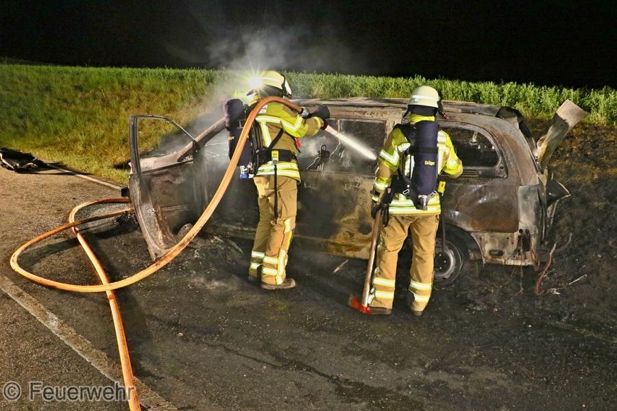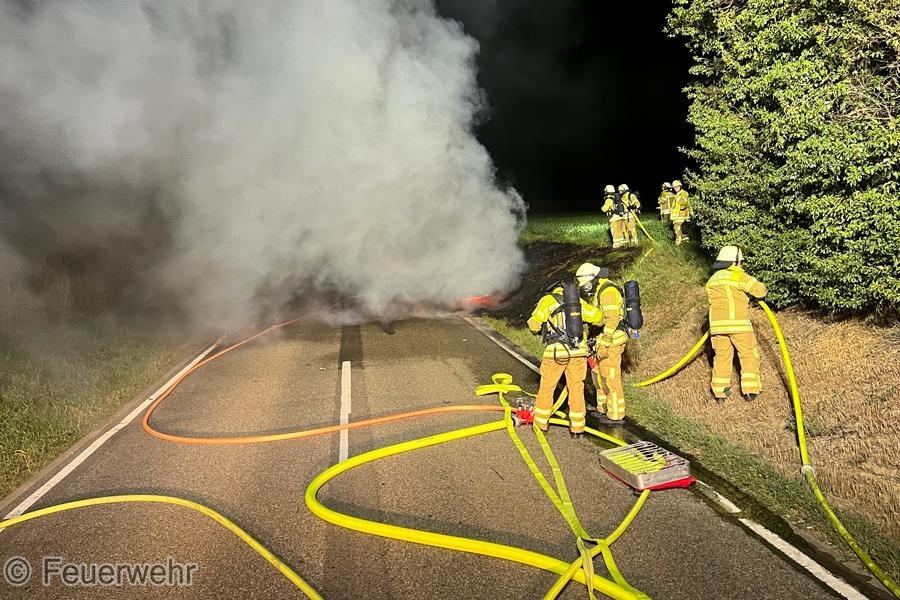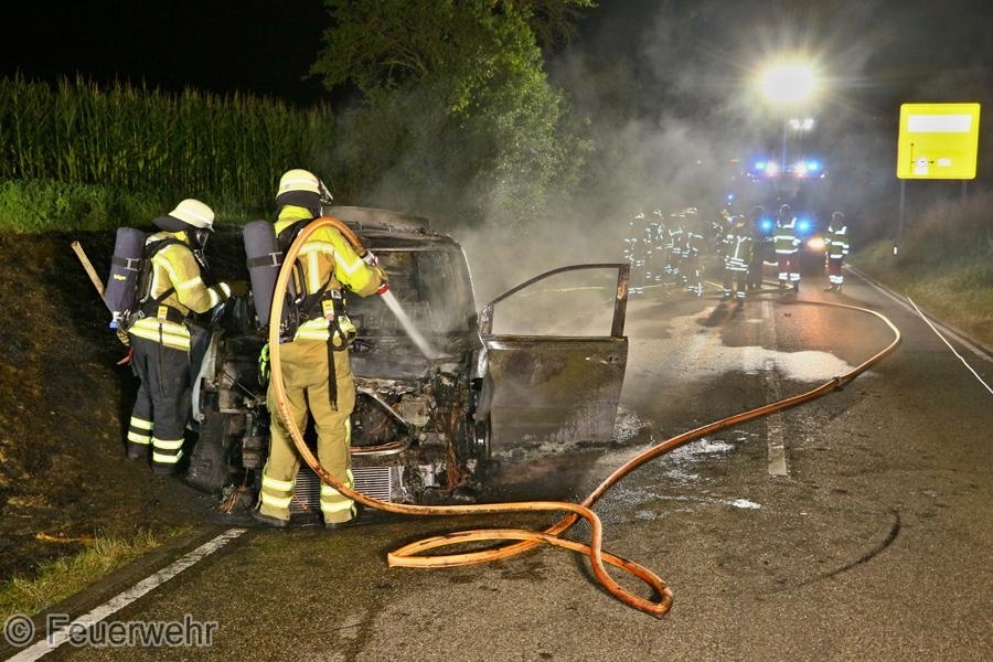 In der Nacht zu Montag wurde die Feuerwehr zu einem Fahrzeugbrand auf die L1140 in Fahrtrichtung Hemmingen alarmiert. Beim Eintreffen stand das Fahrzeug sowie Teile einer Böschung bereits in Vollbrand. Der Brand wurde von zwei Trupps unter Atemschutz mit je einem C-Rohr bekämpft. Da in unmittelbarer Nähe der Einsatzstelle keine Möglichkeit zur Wasserentnahme vorhanden ist, wurde ein drittes Löschfahrzeug zur Sicherstellung der Löschwasserversorgung eingesetzt. Mit Hilfe der Wärmebildkamera wurden im Anschluss noch Nachlöscharbeiten durchgeführt. Während der Einsatzmaßnahmen musste die L1140 in beide Fahrtrichtungen gesperrt werden.